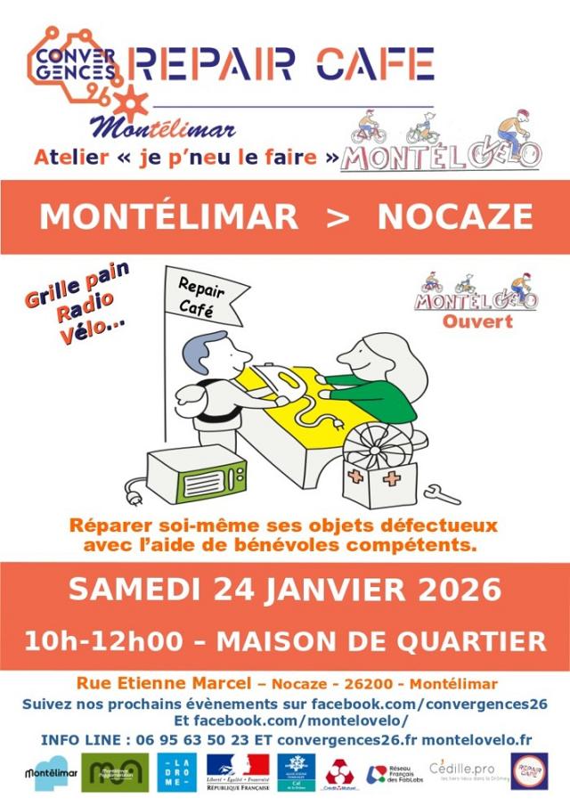 Le samedi 23 janvier s’est tenu le premier Repair Café de l’année 2026. C’était dans la Maison de Quartier de Nocaze à Montélimar. L’association Montélovélo a ouvert également son atelier pour des diagnostics vélo.